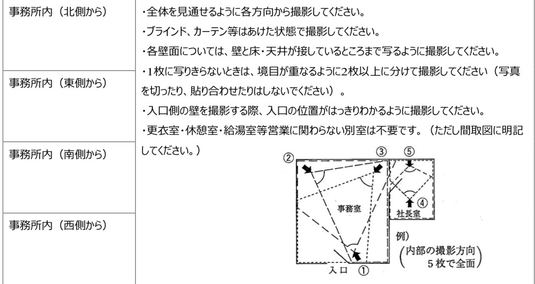➁上記の例のように広角で撮影できれば5枚で済みますが、スマホ等で撮影すると入りきらない場合があり、追加の写真を求められることがあるため、「事務室」「社長室」各四枚ずつ四隅から中央へ向かって撮影するのが無難です。